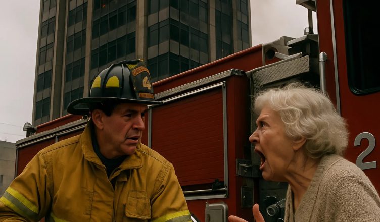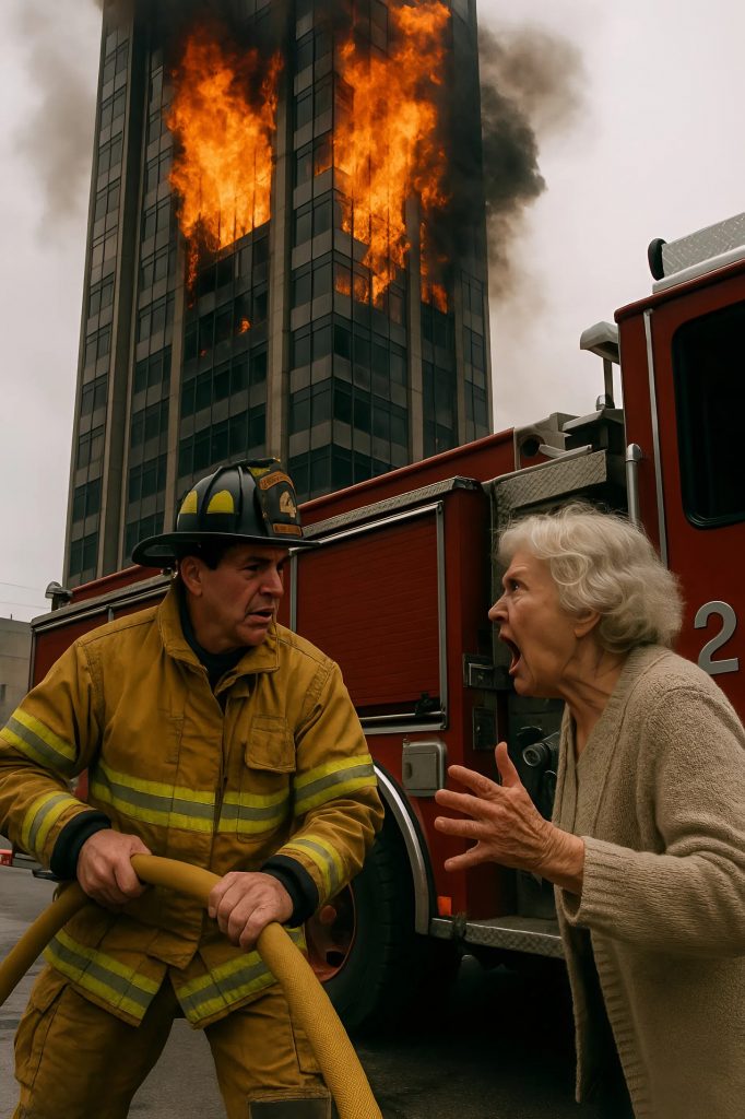 Она бросилась прямо к пожарному, державшему шланг, и, не замечая опасности, начала его обвинять. В её глазах читался страх и отчаяние — возможно, внутри остался кто-то из близких.