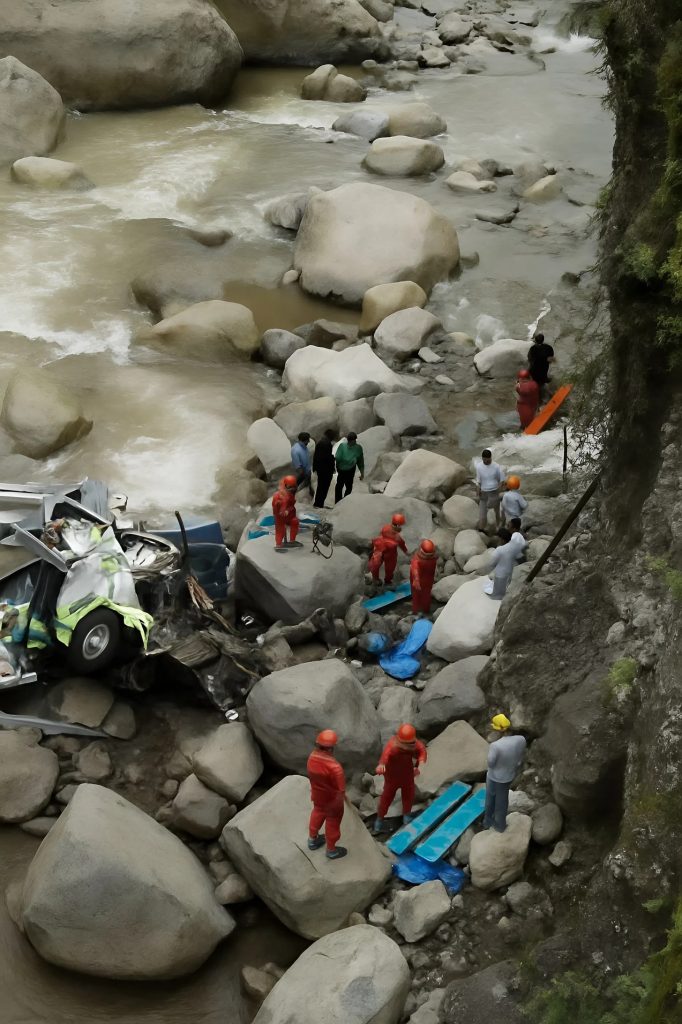 Автобус рухнул с высоты примерно двадцати метров. Удар был такой силы, что кузов разорвало на части, а обломки разлетелись по всей долине. Многие пассажиры оказались зажаты в искорёженных сиденьях.